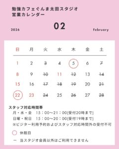 2月スタジオ営業のお知らせ